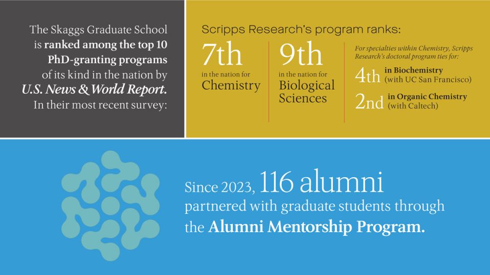Indeed, the growing number of endowed fellowships recently crossed the 100 mark, an ambitious milestone set in 2018 when the Skaggs family’s lead gift launched the campaign and Scripps Research renamed the graduate program the Skaggs Graduate School of Chemical and Biological Sciences. Each endowed fellowship provides valuable funding for one graduate student for three years of their studies, lifting much of the financial burden on their laboratory and enabling more of increasingly limited and uncertain grant funding to be dedicated to critical research infrastructure and essential technologies. (Learn more about the importance of endowed fellowships in “Supporting the next generation of scientists.”)